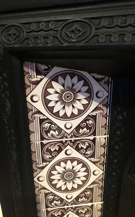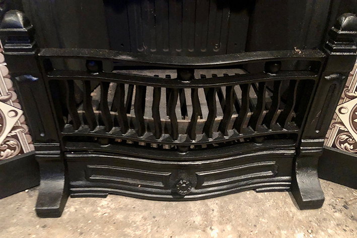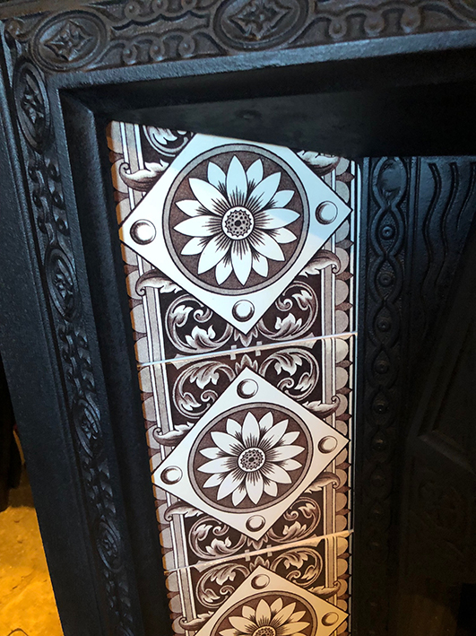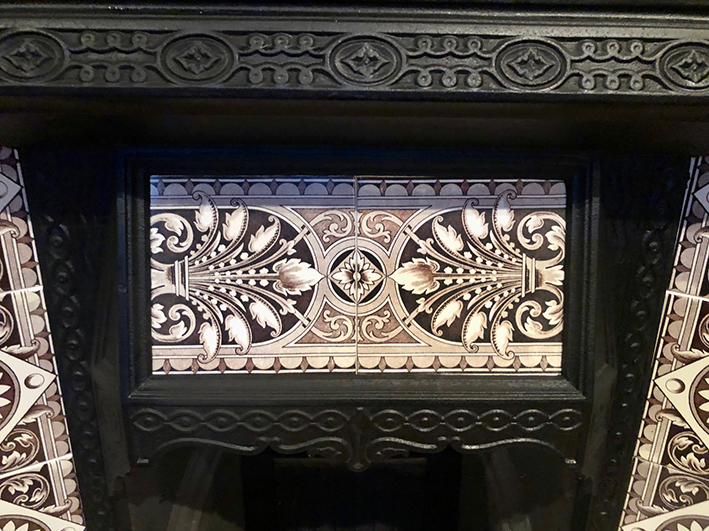 Includes new Aesthetic Movement tile set, cast iron back, grate and bars.